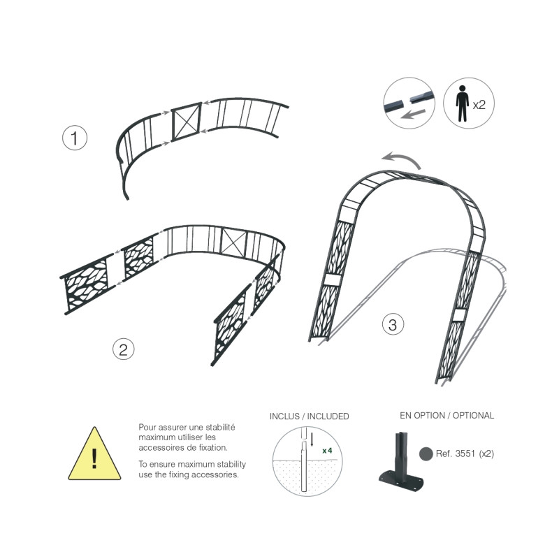 Il vous faudra des éléments de fixation adaptés en fonction du sol où sera placée l'arche, c'est pour cela que le coq vous met à disposition les éléments de fixation suivants : le pack de deux pieds à visser (pour une terrasse par exemple) disponible ici.