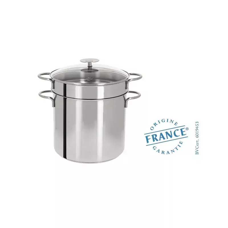 Découvrez l'ensemble cuit-pâtes en acier inoxydable, composé d'une marmite Mutine fixe, d'un diamètre de 22 cm.