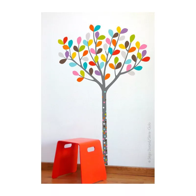 Découvrez ce sticker représentant un arbre avec les feuilles de toutes les couleurs et une écorce elle aussi colorée.