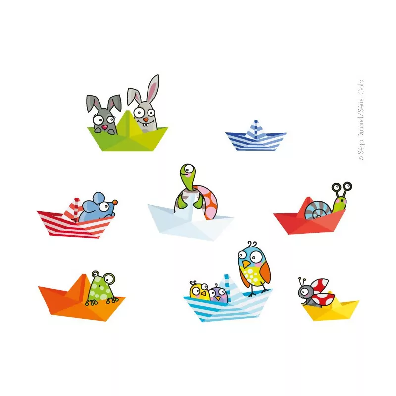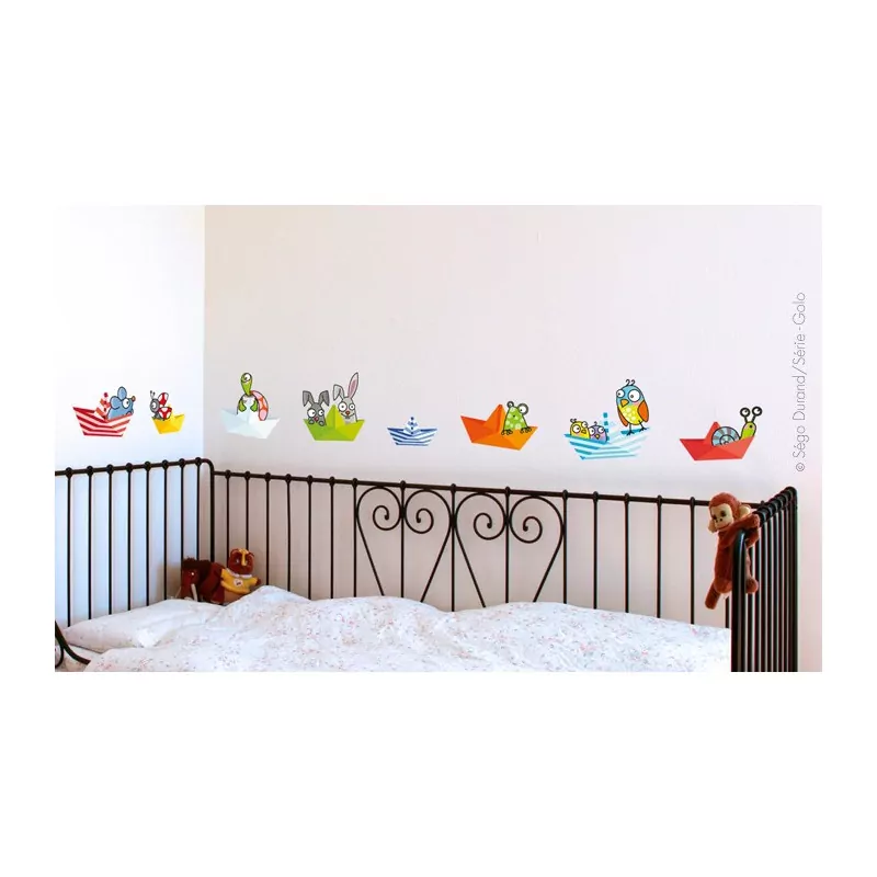 Les lapins, les oiseaux, la souris, la grenouille, la coccinelle et l'escargot, ces 9 petits bateaux sont prêts à naviguer ensemble ! Très colorés, ces stickers sont imprimés sur vinyle satiné, pour un rendu de haute qualité. De plus, ces stickers sont dessinés et imprimés en France par Série-Golo, petite entreprise spécialisée dans les objets décoratifs et les stickers pour enfants.