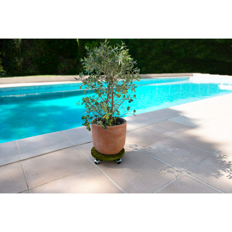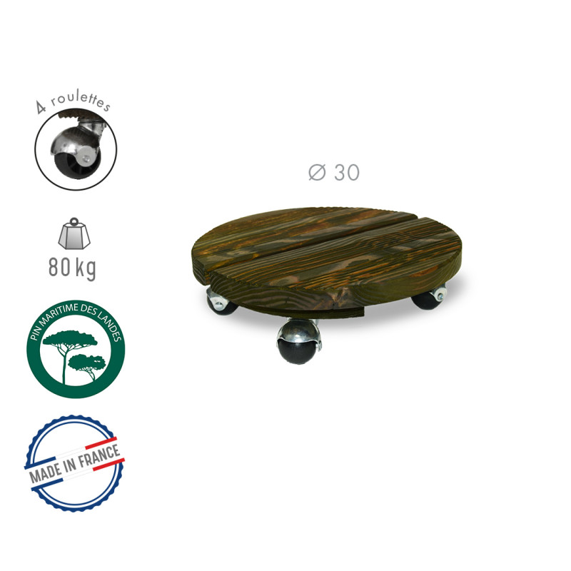 Ce roule plante en bois rond teinté vert est fabriqué en pin maritime des Landes. Ce produit Made in France, d’un diamètre de 30 cm, dispose de 4 roulettes. Veillez à répartir le poids uniformément sur le roule plante.