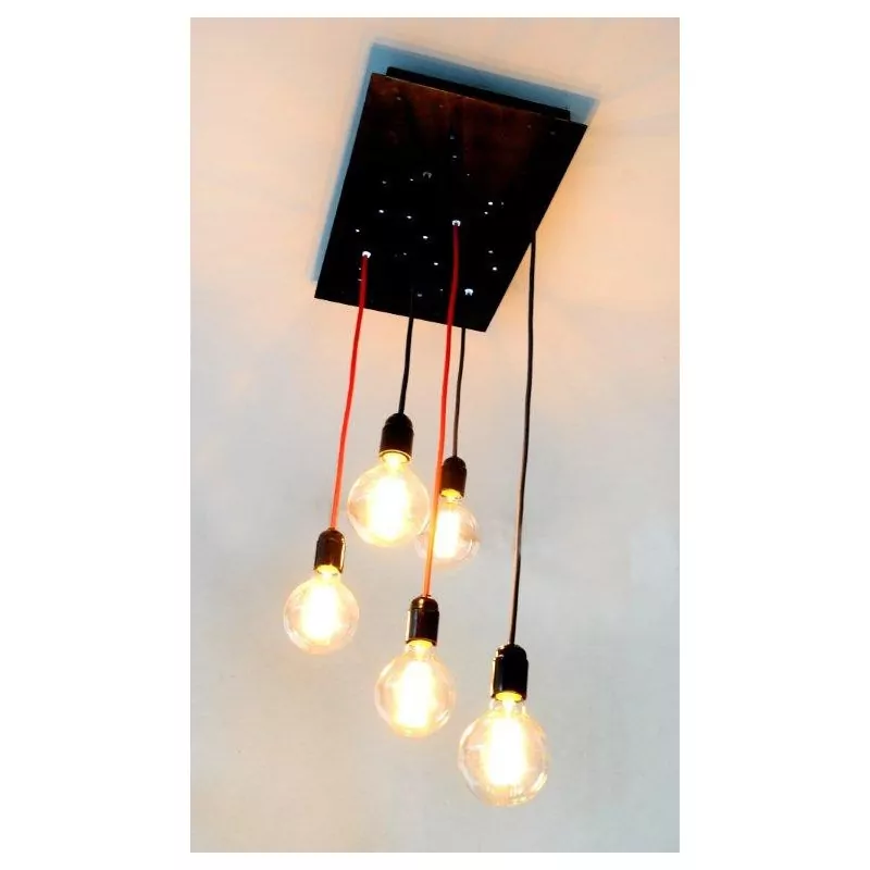 Découvrez la suspension Boren par CLF Création ! Cette suspension possède une base de fixation en métal brossé vernis à fixer au plafond ainsi que 3 fils gris en tissu et 2 fils rouge en tissu. Ainsi, Boren fonctionne avec 5 ampoules à filament type Edison. Cette suspension apportera une touche de design à votre décoration intérieure.