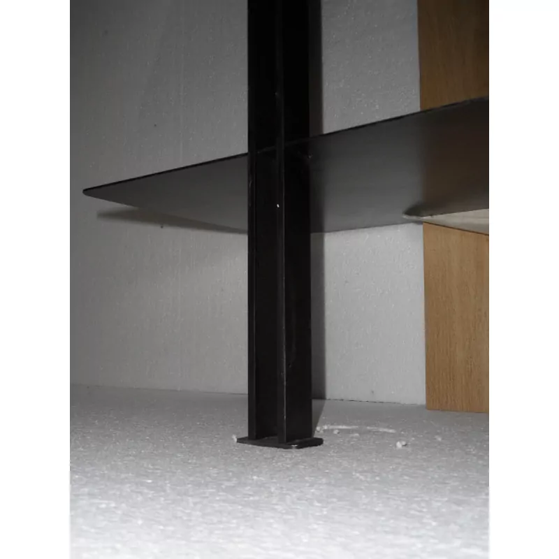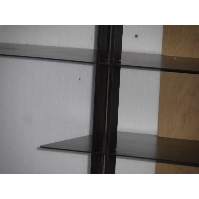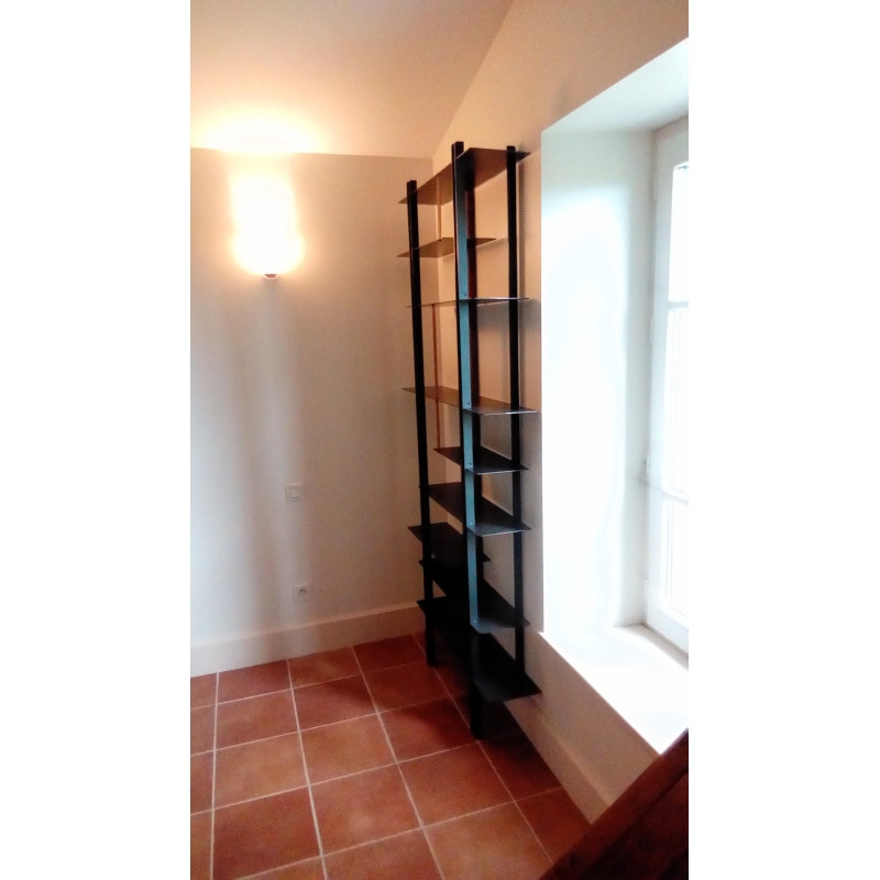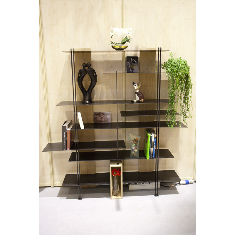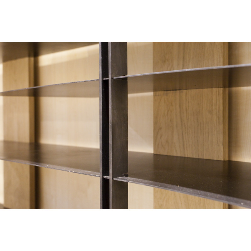 Bibliothèque design CLF Création sur une base et un caisson en chêne massif vernis. Plateaux d'étagères en métal brut brossé ciré. La bibliothèque est entièrement démontable.