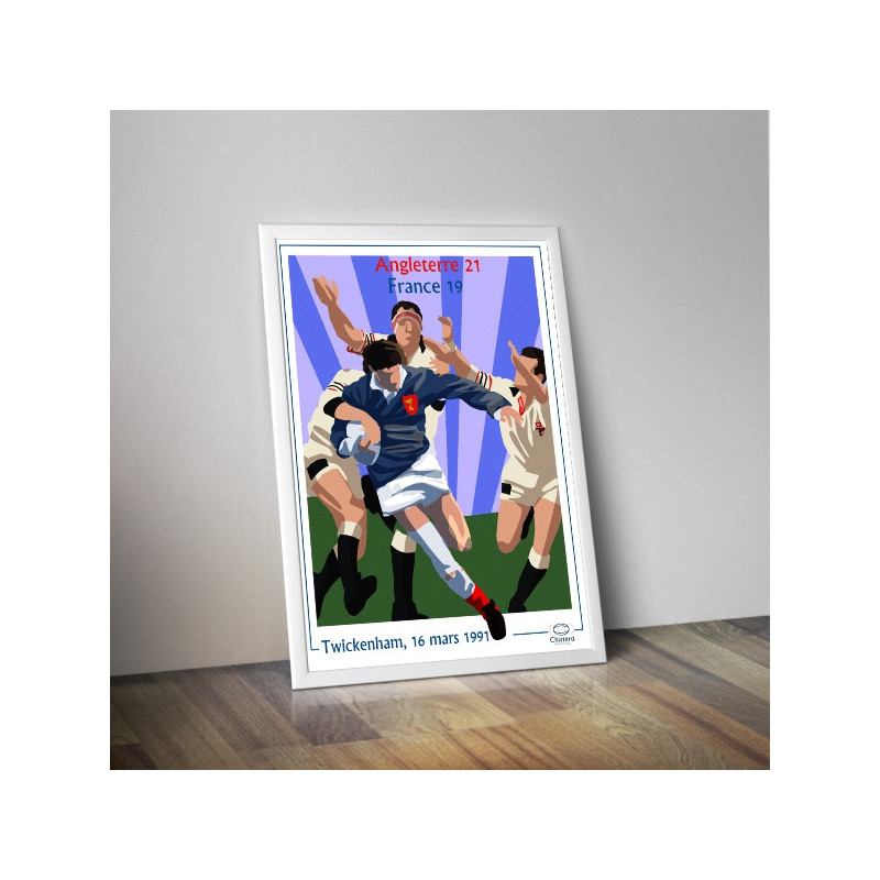 Vous retrouverez donc sur cette affiche le Rugbymen prenant ses jambes à son cou pour distancer 3 adversaires Anglais, permettant ainsi à la France de marquer un essai.