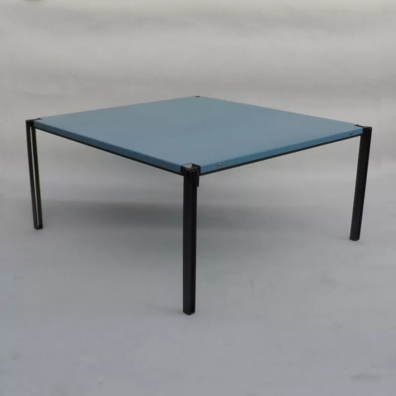 Table basse en acier CLF Créations. Avec un pietement en acier brut vernis et un plateau en acier peint satin (couleur à choisir bleu, rouge ou blanc).