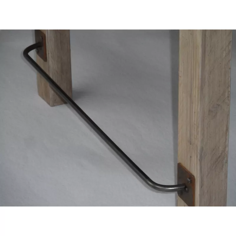 Table de séjour design CLF Création de type industriel avec plateau vintage en métal vernis et piètement en bois vernis avec patine.