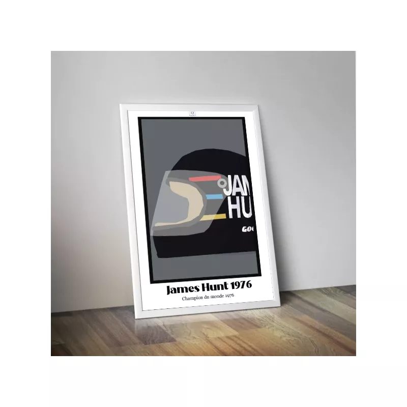 Fabriquées sur du papier 250gr/m2, cette affiche au rendu semi-mat mets en avant le casque noir iconique de James Hunt avec sa grande visière, ses trois bandes colorées (rouge, bleu, et jaune), sans oublier son nom écrit en lettres capitales blanches.