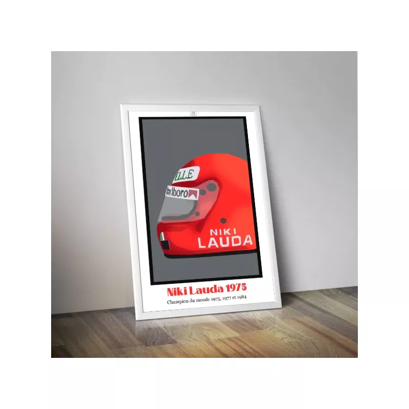 Sur cette affiche, vous retrouverez le casque voyant, mais sobre qu'il portait lors de son couronnement lors de son deuxième titre de champion du monde de formule 1 en 1977, un casque à la couleur qui n'est pas sans rappeler une certaine marque italienne au cheval cabré, avec son nom écrit sur la partie inférieure du casque en lettres majuscules blanches.