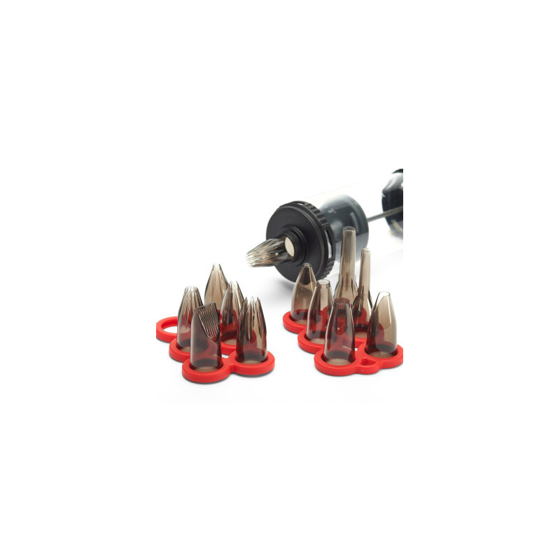- 12 douilles en Tritan : un matériau résistant et durable, qui vous offrent une multitude de possibilités pour réaliser des décors variés et originaux. Vous disposez de 3 douilles unies de diamètres 6 mm, 11 mm et 13 mm ; 3 douilles cannelées avec les tailles B8, C8 et E8 ; 2 douilles spéciales pour les Petits Fours avec les tailles PF10 et PF14 ; 1 douille St Honoré ; 1 douille à garnir de 6 mm ; 1 douille à garnir les verrines de 10 mm.
