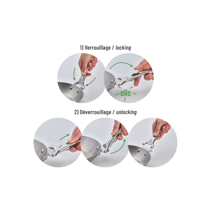 Son système d’accroche simple permet une manipulation à une seule main, rassure grâce à son ‘click’ de verrouillage et permet des gestes de cuisine en toute sécurité.