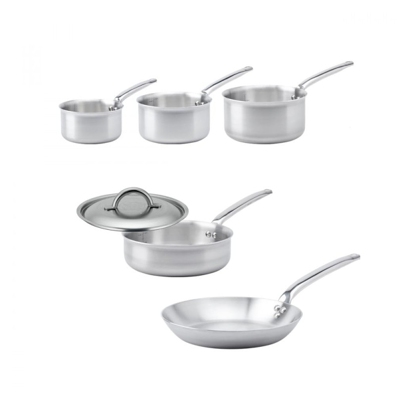 La batterie Alchimy, 3 casserole, 1 sauteuse, 1 poêle et son couvercle fabriqué par De Buyer.