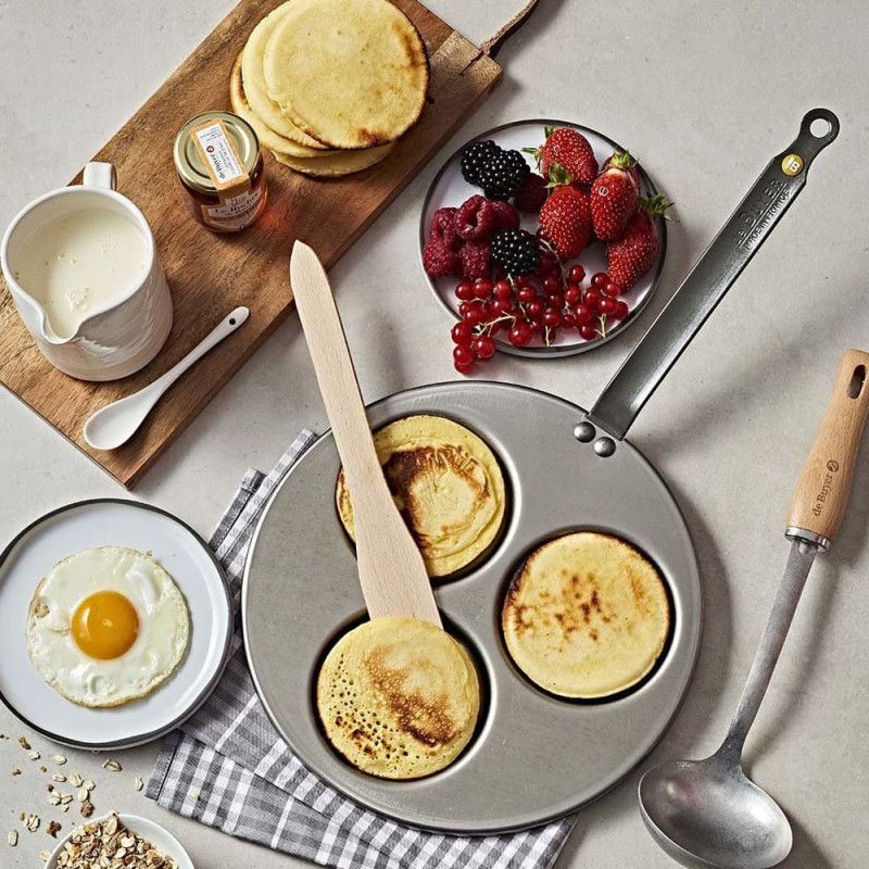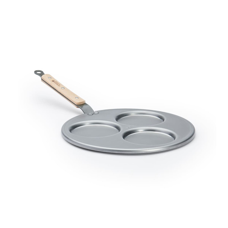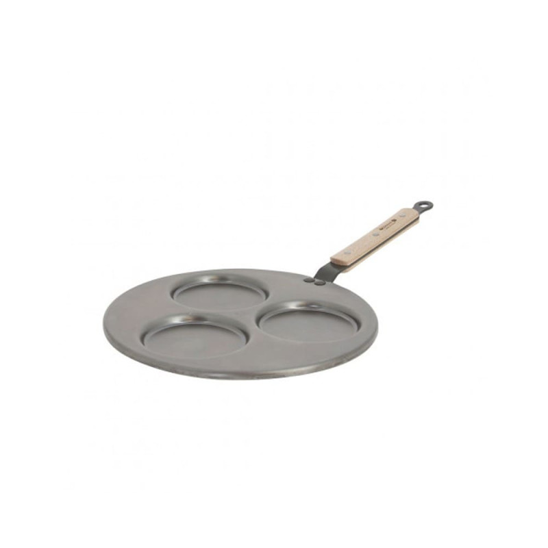 La poêle spéciale 3 blinis en Minéral B manche en bois fabriquées par De Buyer.