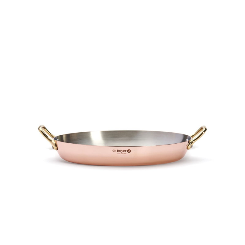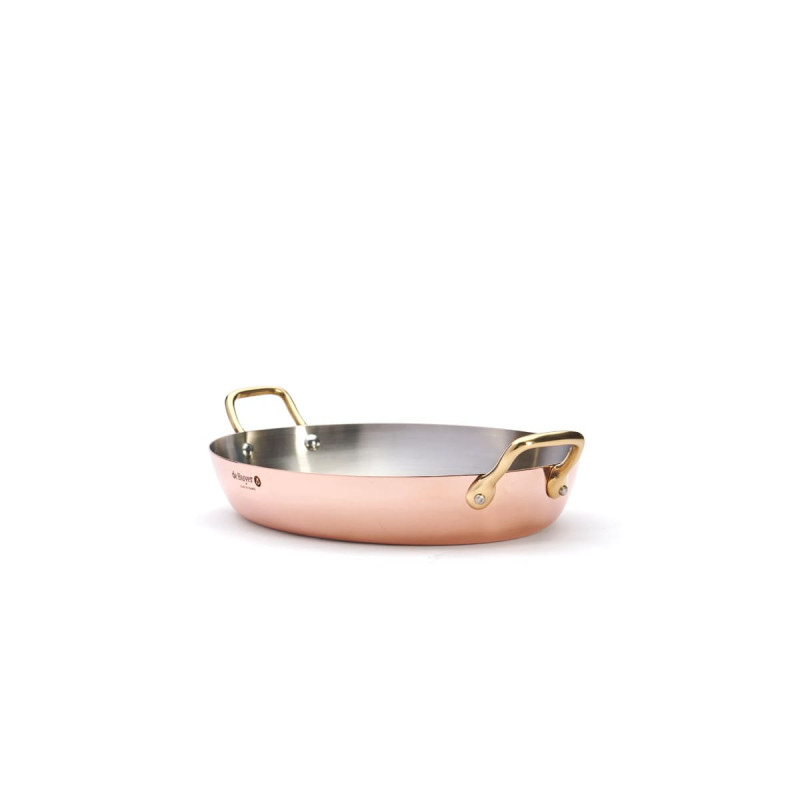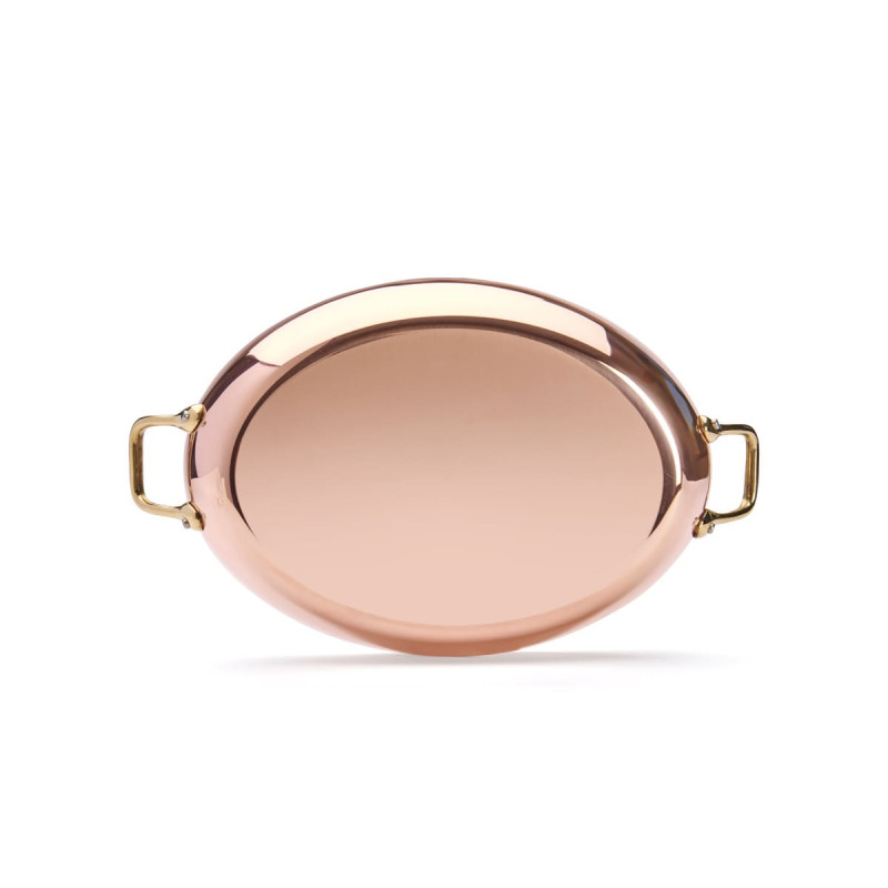 Le plat ovale en cuivre et Inox avec ses anses en laiton de la collection Inocuivre fabriquée par De Buyer.
