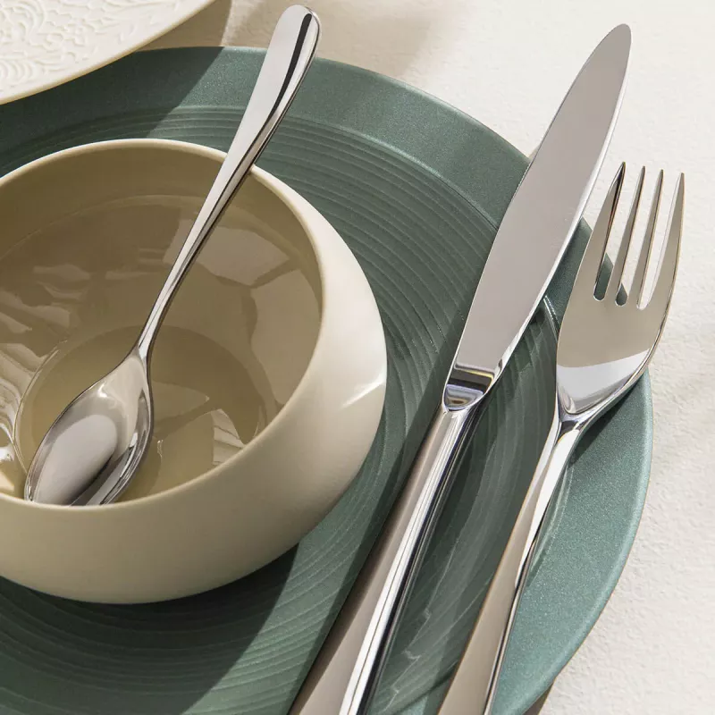 Les lignes souples et harmonieuses s’associent à une ergonomie sans faille, offrant confort et finesse à l’usage. Réalisée en acier inoxydable 18-10, cette collection n’est pas seulement belle à regarder, mais aussi conçue pour durer et simplifier l’entretien, assurant ainsi une présence durable et pratique dans le quotidien comme dans les moments de célébration.