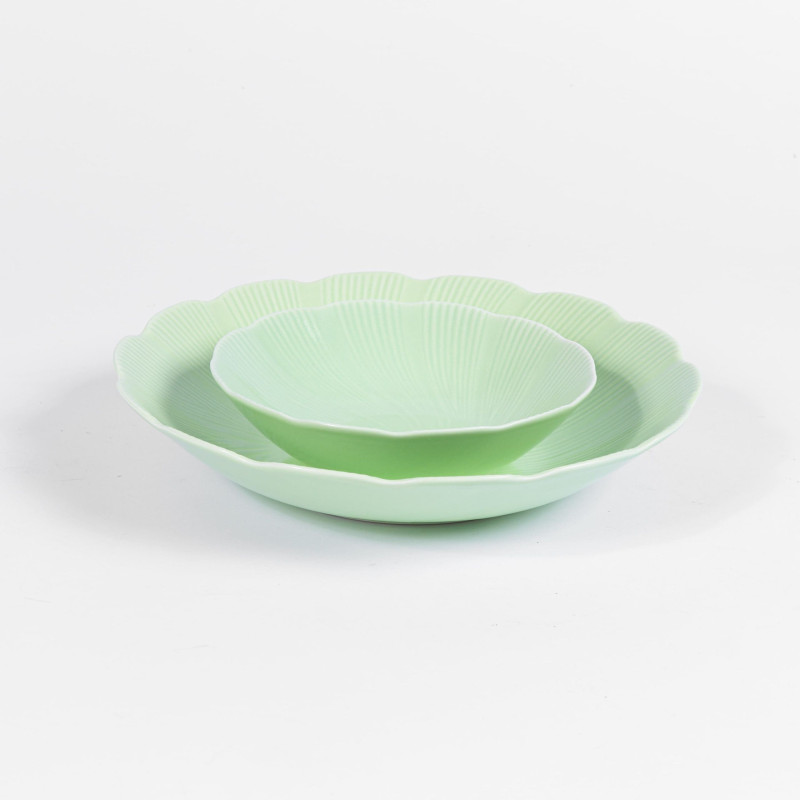 Les assiettes de la nouvelle collection TAHITI en porcelaine de Limoges de couleur verte fabriquées par Ogre La Fabrique.