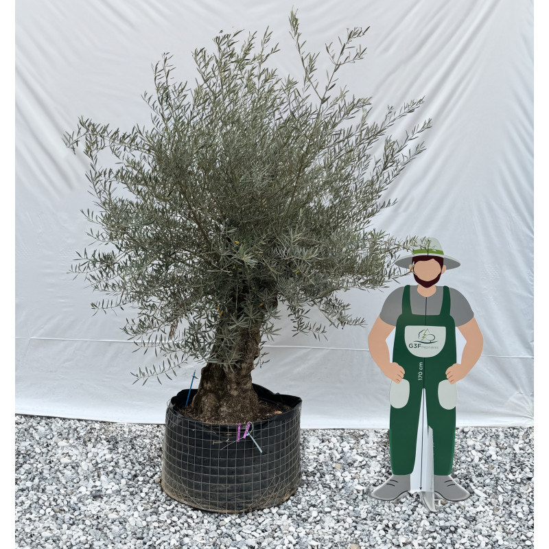 L'olivier de 120/140 cm de circonférence et de 200/250 cm de hauteur en motte grillagée cultivé par G3F Pépinières.