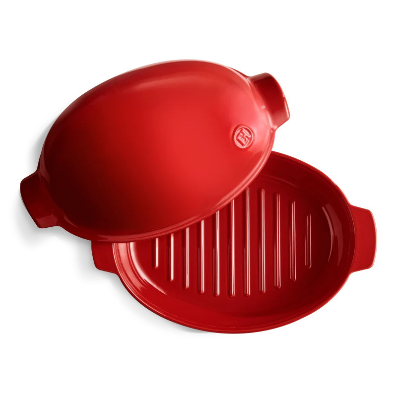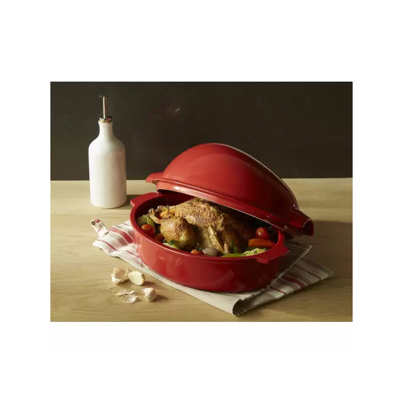 La céramique permet une diffusion optimale de la chaleur garantissant une cuisson moelleuse à l'intérieur et dorée à l'extérieur. Les rainures présentent dans le fond de la brique éviteront aux aliments de coller. Grâce à son couvercle, le circuit naturel de la vapeur est favorisé. Vous n’aurez plus besoin d’arroser régulièrement votre viande et votre four restera bien propre !