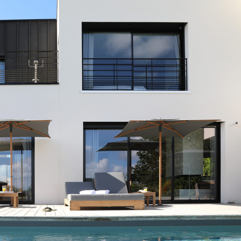 La gamme Nuvola comprend des parasols droits et des parasols déportés. Ces parasols sont conçus pour apporter de l'ombre et du frais avec élégance à votre espace extérieur. Selon les dimensions de votre parasol vous pourrez protéger un transat, un bain de piscine ou bien une table pour 10 personnes.