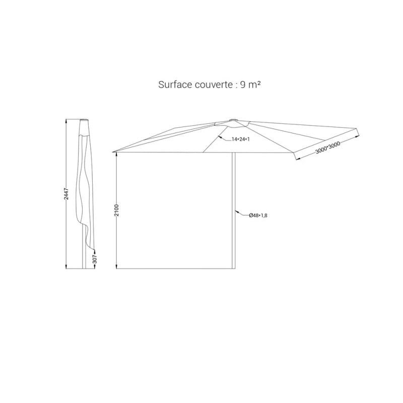 Ce parasol droit, de grand format (3m sur 3m), est fabriqué uniquement avec des matériaux haut de gamme. La toiles est une toile Sunbrella® et une structure en aluminium avec baleine et amortisseur.