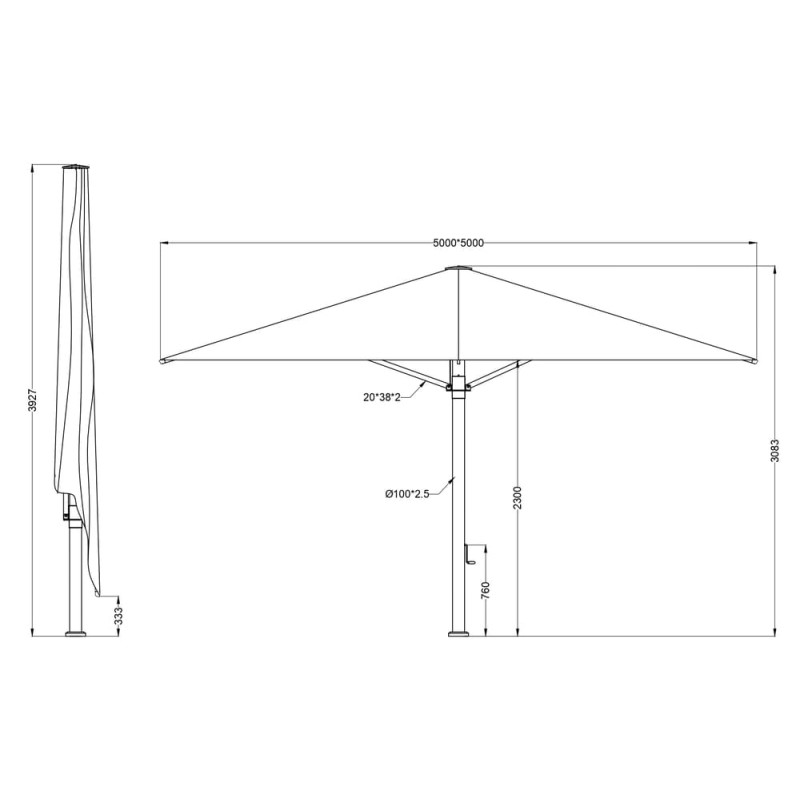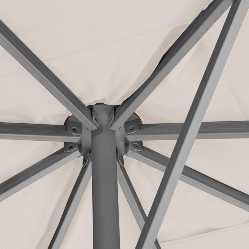 Ce parasol droit, de très très grand format (5m sur 5m), est fabriqué uniquement avec des matériaux haut de gamme.