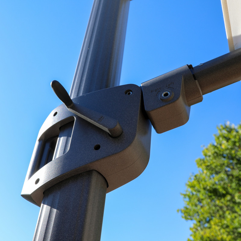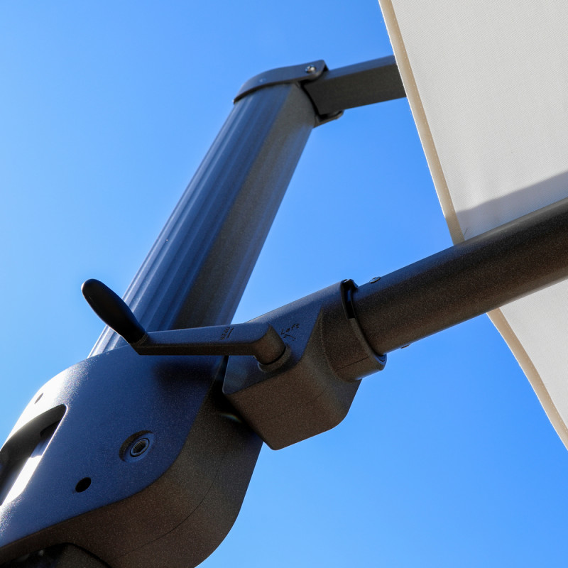 La toile est un tissu Sunbrella®, la structure est en aluminium renforcée avec un mât 75x100mm et 2.2mm d’épaisseur. Cette structure “super strong” permet suivant les calculs du département R&D une inclinaison extrème.