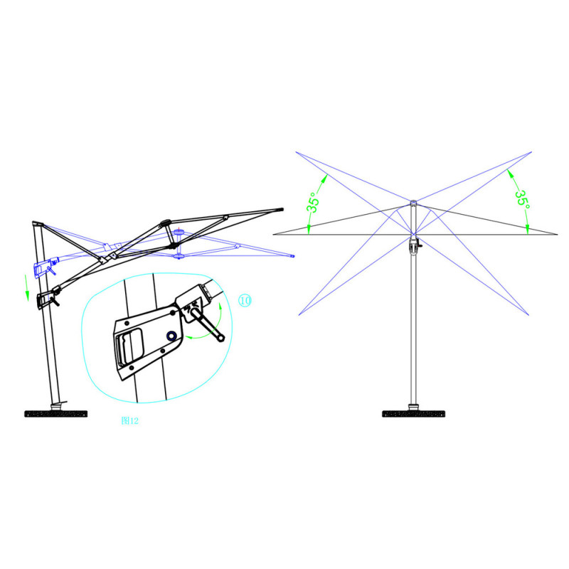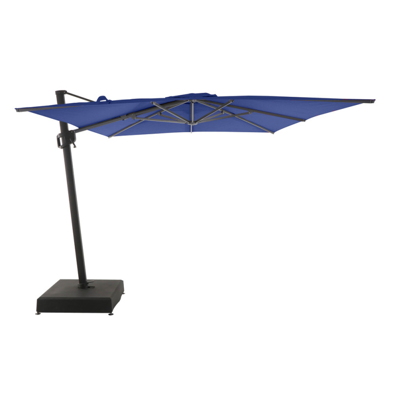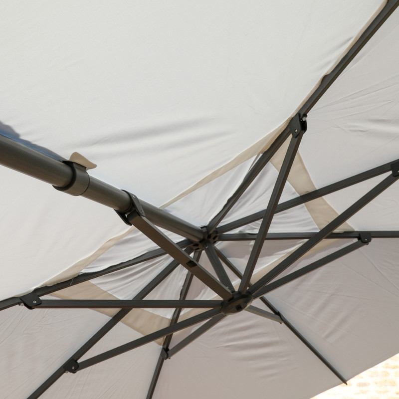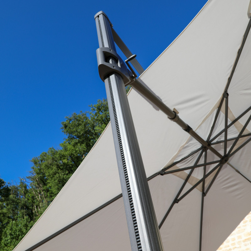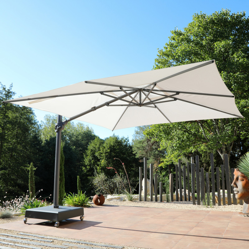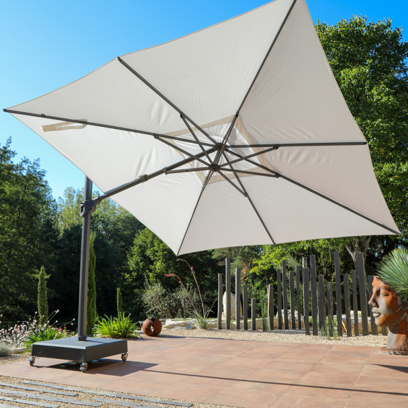 Ce parasol déporté, de très grand format (3,50m sur 3,50m), est fabriqué uniquement avec des matériaux haut de gamme.