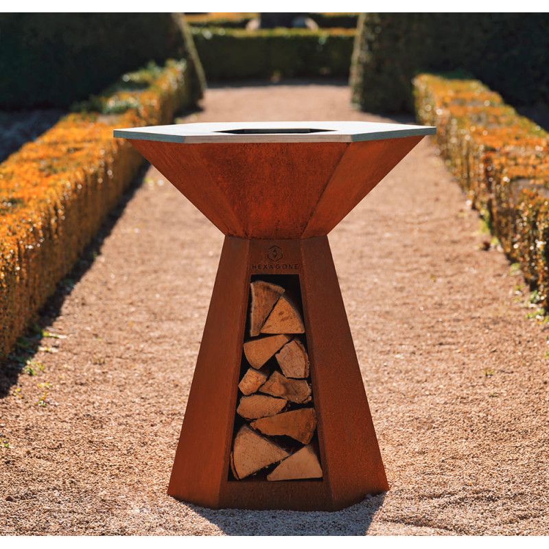 Le Brasero Plancha modèle "Agape" finition corten et de 85 cm de diamètre fabriqué par HEXAGONE.