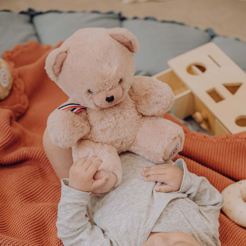 Découvrez. l'Ours Français, la peluche de 35 cm qui accompagnera le bébé avant et après la naissance.