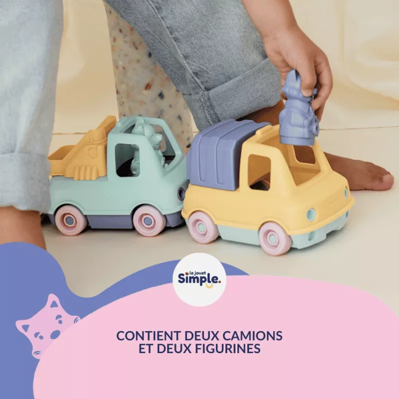 Découvrez le coffret de camions du quotidien, composé d'un camion benne et d'un camion poubelle, pour des heures de jeu créatif et éducatif. Ce coffret inclut également deux figurines de renard pour accompagner les camions dans leurs aventures. Conçus pour éveiller l'imagination des enfants dès 12 mois, ces camions s’assemblent pour former un petit train grâce à un système de crochets à l'avant et à l'arrière.