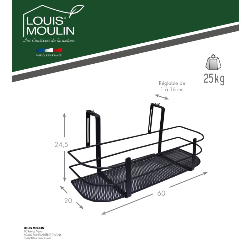 Fabriqué par les équipes de Louis Moulin dans leurs ateliers de Saint-Laurent d'Agny, le support balconnière est peint avec une peinture anthracite epoxy permettant une résistance au gel et aux Uv. Ainsi, vous pourrez l'installer aussi bien en intérieur qu'en extérieur.